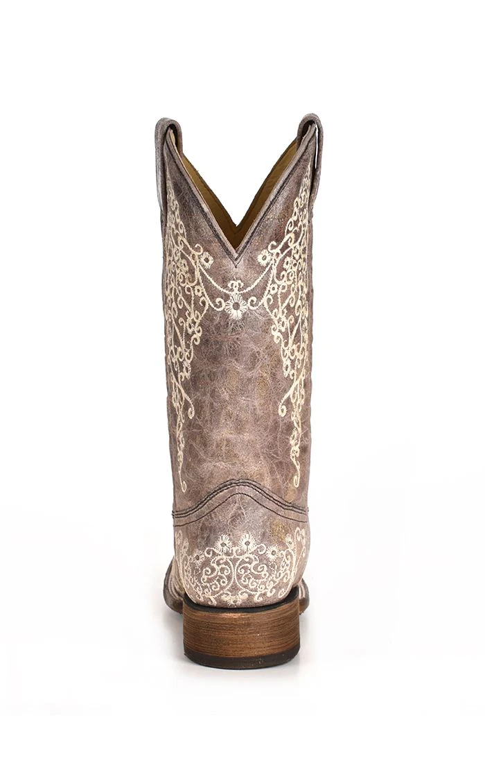 Brown Crater Square Toe Western Boot with Bone Floral Embroidery.